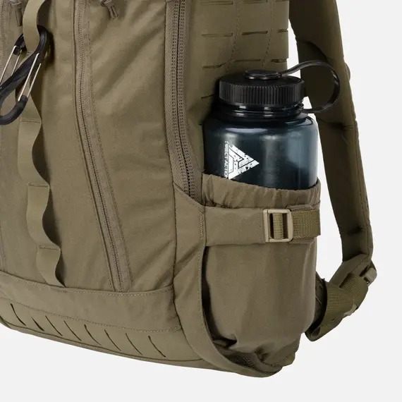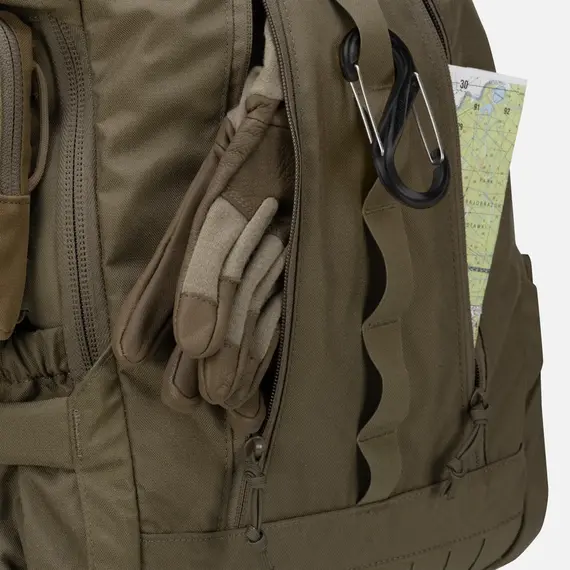 Спереди имеется сетчатый карман на молнии и два небольших наружных кармана на молнии, один из которых на велюровой подкладке для очков. Также имеется большая петля для идентификации или размещения маркера "свой-чужой", два плоских кармана с диагональными молниями и "ромашковая цепочка". Внизу расположена модульная панель для дополнительных карманов, а по бокам имеется трехрядная система MOLLE/PALS с частично эластичными карманами для бутылок или фляг и отверстиями для системы увлажнения.